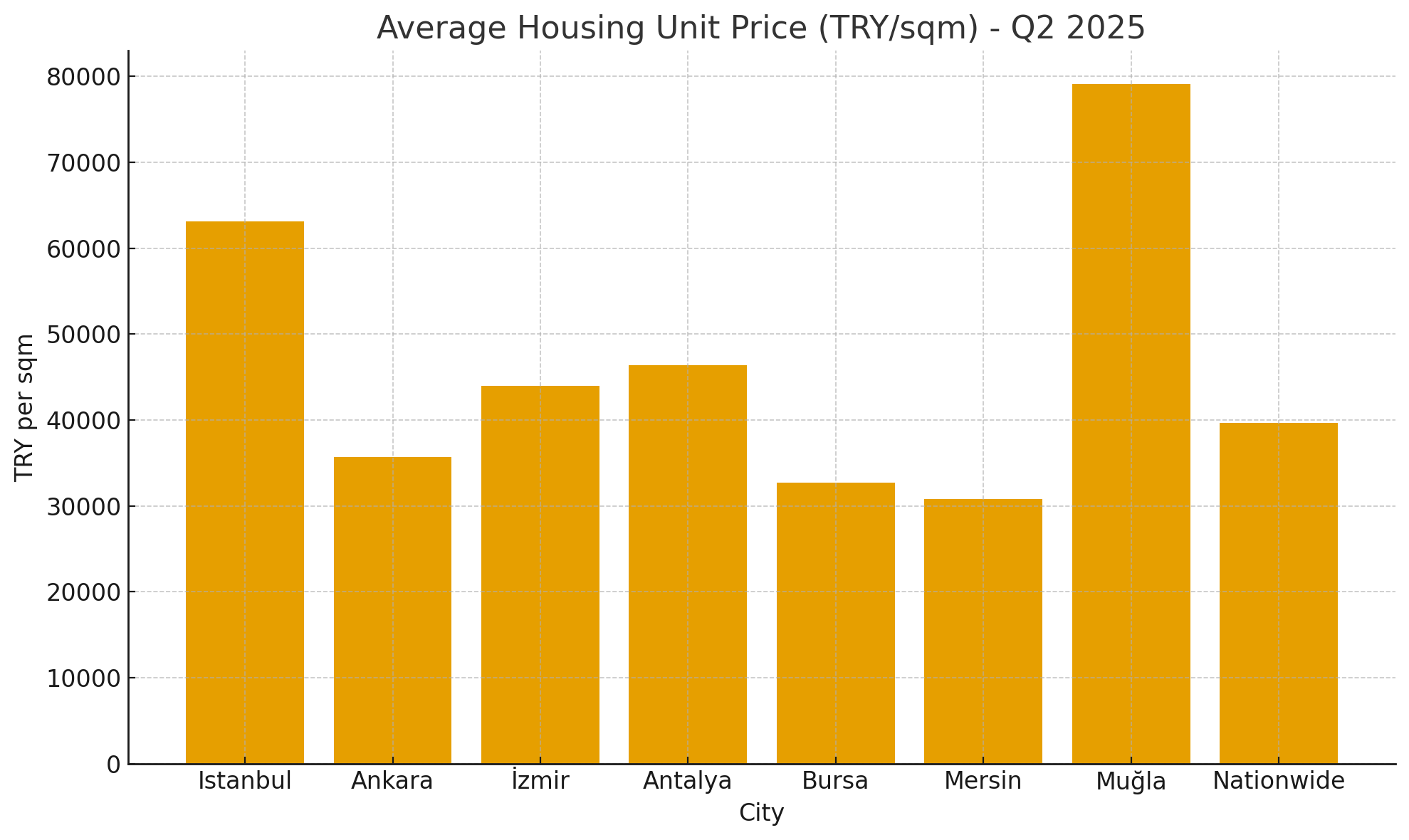 - Nationaler Durchschnittspreis (Q2 2025): TRY 39.697 / qm (USD 1.025).